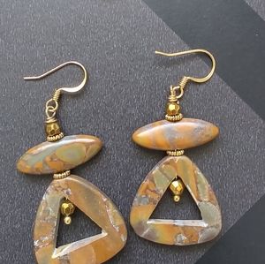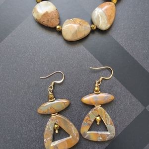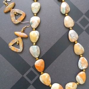 Pretty one of a kind, Natural stone, with facet cut. The stone is Jasper. Necklace has warm colors that can be worn with many colors. Hand strung by me with cooper metal beads. Earrings added to give a complete look. Wear necklace alone or with earrings. Earring can be used alone as well.