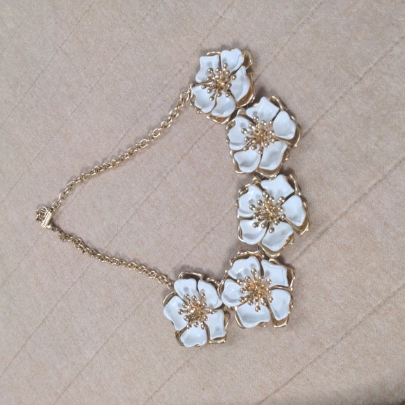 sugar fix necklace sits on collar bone white flower on gold base