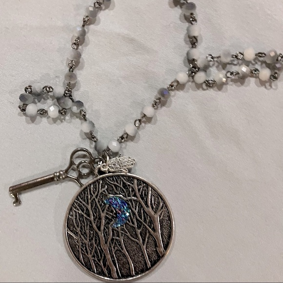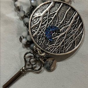 Handmade necklace. The pendant has an engraved forest background with a small moon that is a beautiful blue. The pendant is about 3 times bigger than a quarter. I put a key on all that I make to represent the doors we need to open and even close. It symbolizes strength. There is a charm that says believe and the chain is beaded with pearl like beads and black almost transparent beads.