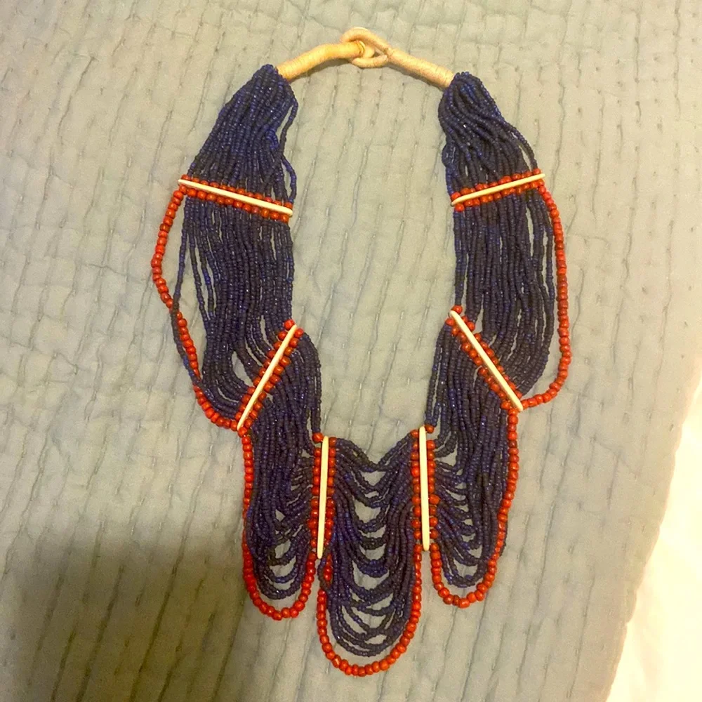 Large, bead necklace. Navy blue with red and white accents