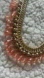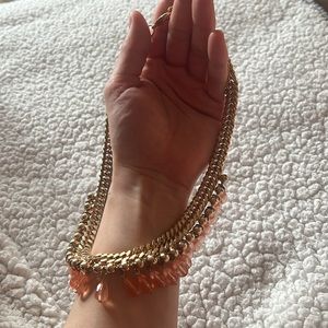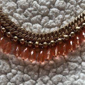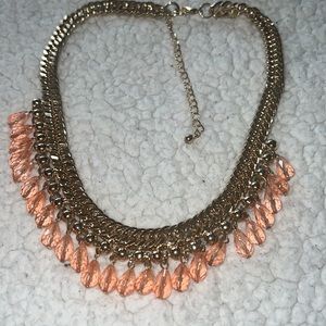 Necklace 💗 charming Charlie, gold color chain necklace with dangling pinkish/peach color beads. Light in weight. One part of the necklace looks like a section has a slight tarnish to it (refer to photos I took another photo to show the color of the other side). This probably happened from me wearing it on my skin from maybe body creams or perfumes I used. However it’s only one section of the necklace and you can wear that part against your skin so it will not show.