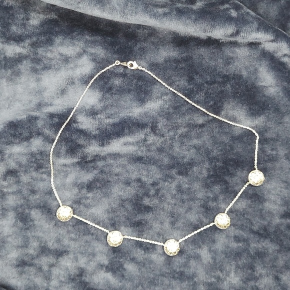 Silver colored necklace, 5 charms dangle on a 8 inch chain.
