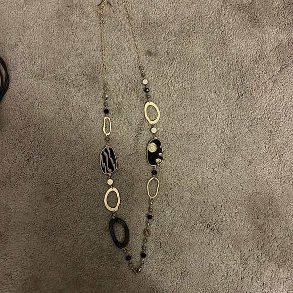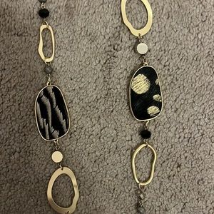 Long, 20” gold with black accents. Can be doubled to become a two-layer necklace.