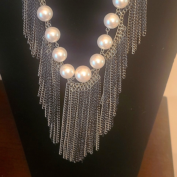 Multi chain pearl necklace. Silvertone between pearls. Chains are goldtone & black