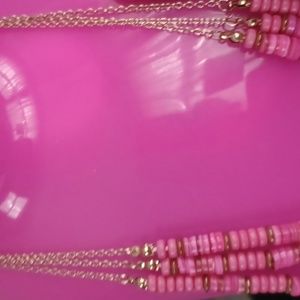 3 rows of pink and gold, pink are in sections with gold metal, at the end of the neck chain are gold beads