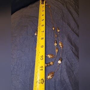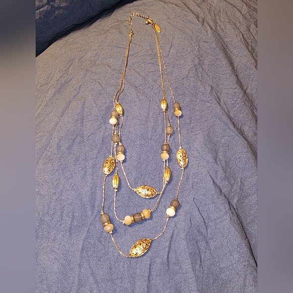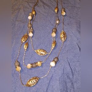 Layered necklace. Gold chain, gold decorative pieces with grey and white beads on the chain as well. Adjustable neck clasp.