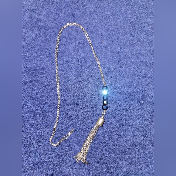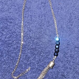 New necklace, silver in color chain. chain approx 28 inches, tassle approx 3 inches, navy blue beads.