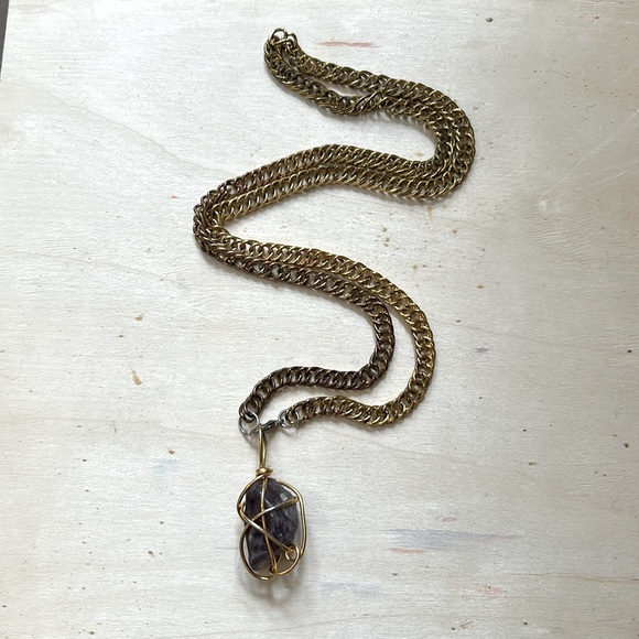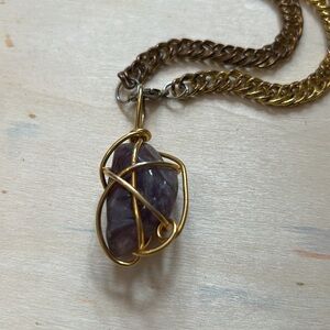 Necklace, tumbled amethyst wire wrapped stone on gold color thick chain. Hang length measures about 15”.