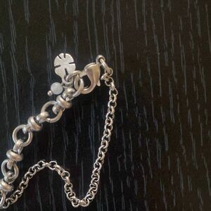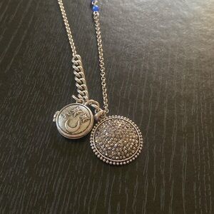 Long necklace with blue beads , locker and charm.