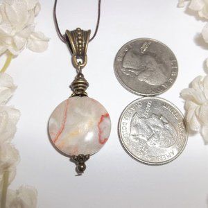 You are going to love the color combinations on this bohemian style beaded necklace! People are sure to give you lots of compliments when you wear it. Brand new & handmade by me - wvluckygirl. Handcrafted with a big faux jasper gem stone circle beads with grey, rust orange, cream, and hints of yellow. So pretty! It has rustic brown bronze toned costume jewelry beads. Pendant and decorative bail measure 2 inches tall & 3/4 inch wide. Comes with a 36 inch brown nylon rope cord string. It is adjustable in that you can tie it to any length you want to wear it. Double it up around your neck and wear it as a short layered look choker. Wear it long with other necklaces for that trendy stacking look. You could even take the pendant off and add it to a necklace you already own to change up your look. Buy it now before someone else steals it away from you!