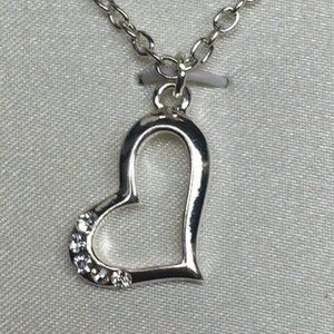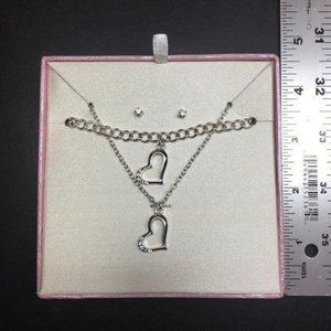 Boxed gift set of a Silvertone necklace, bracelet and stud earrings with heart rhinestone sparkle pendants!