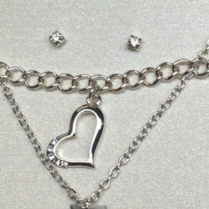 Necklace Bracelet Earrings Gift Set Silver Chain Heart Rhinestone Stud Pierced