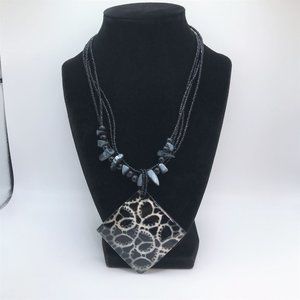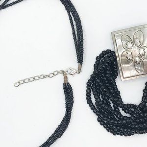 2) 4 strand necklace with black glass seed beads, black acrylic beads, gray dyed MOP chunks and a square shaped MOP pendant with a black print design. Silvertone lobster claw clasp. 3"H pendant. 19 1/2"L including 1 3/4" extension chain.