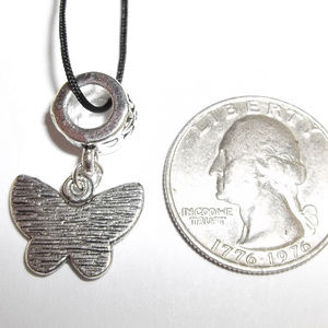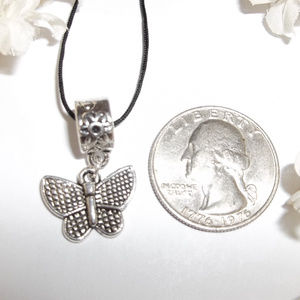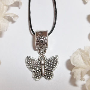 This beautiful NWT removable pendant necklace was handmade by me. Done with silver toned costume jewelry butterfly that were antiqued in black. Pendant and bail measures 7/8 inches tall & 5/8 inch wide. Included is a thin black 36 inch nylon cord string that you can tie to any length you want to wear it. Great for that layered look. Great gift idea for her!