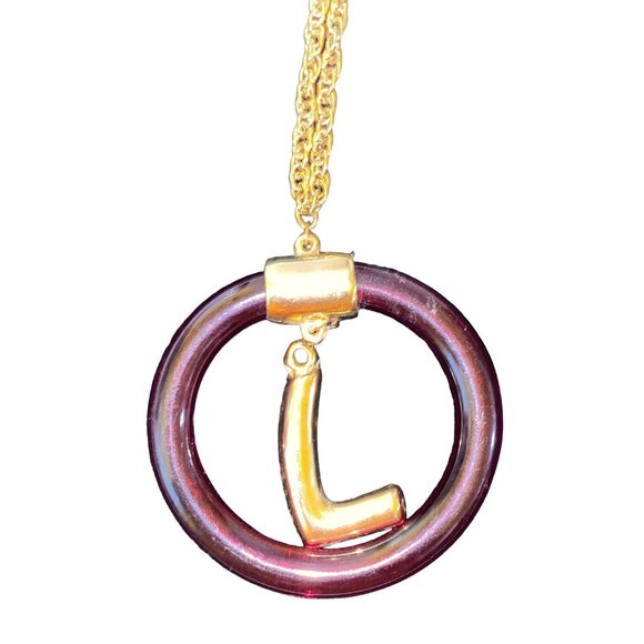 A chic, stylish necklace that features a brown circle L pendant. This women's accessory is made of durable plastic and metal, boasting a gold chain that is 24" long.