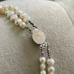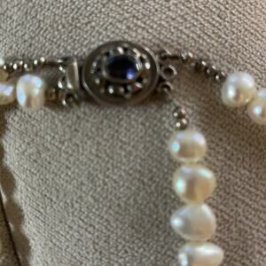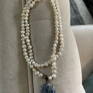Necklace DRUZY - blue in silver case with white double strand pearls that are irregular pearls shaped. Silver clasp vintage with colored stone A piece of art. organic look to them. They make wonderful pieces of jewelry with their iridescent colours, natural shapes and the way they sparkle in the light. No two stones are the same and therefore no two pieces of jewelry are the same either, every stone is totally unique . Their natural beauty makes them a perfect pairing for any bohemian or elegant evening outfit. 8 3/4 from closed clasp Down to pendent attachment. Then plus 2 14 pendent with attachments