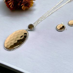 This is a Gold & Silver toned necklace and earring set that can be worn casually, to work, special occasions and everything in between. A great statement necklace that can have a shorter style at 18 inches or go as long as 21 inches. The large 2.5" oval pendant necklace is complimented with round 20mm gold/silver tone drop earrings on a french wire.