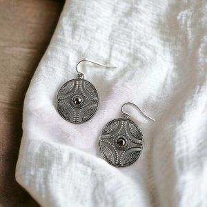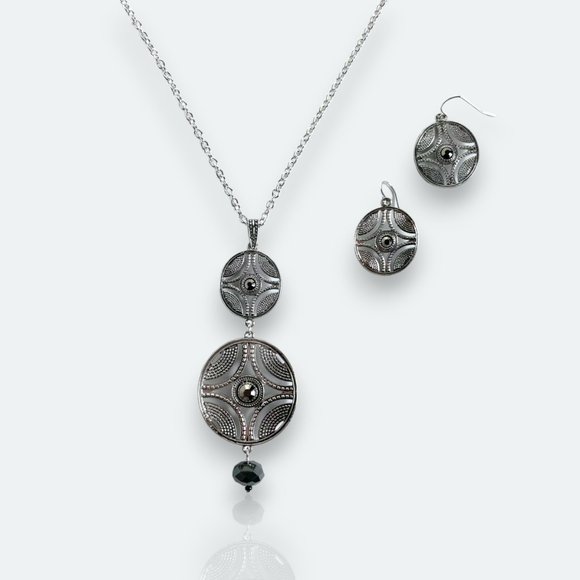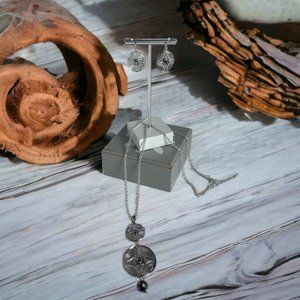 This antique style necklace and earring set makes a classy perfect statement. The 25mm round medallion earrings on french wire drops make your look complete. This necklace and earring set is sleek sophistication at its finest.