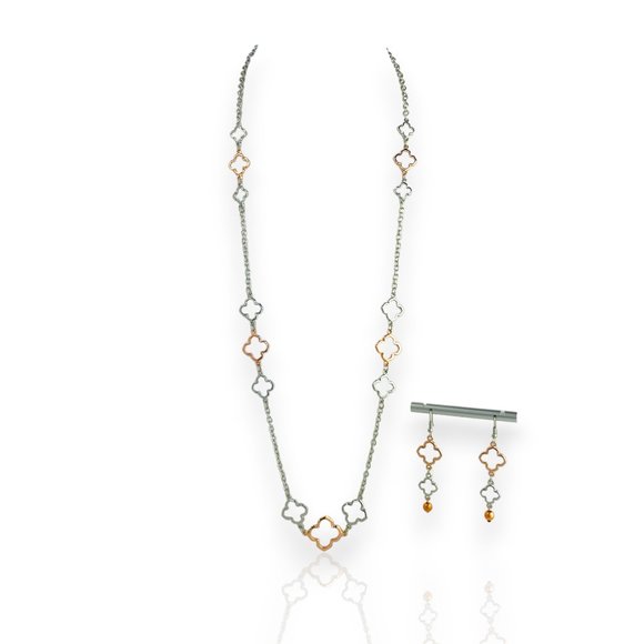Necklace & Earring Set, Silver-Copper Tone, Quatrefoil Design, 30"- 33"