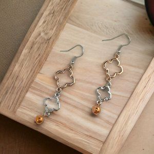 This is quatrefoil design linked silver & copper toned necklace and earring set that can be worn casually, to work, special occasions and everything in between. A great statement necklace that can have a shorter style at 30 inches or go as long as 33 inches. The 2.5 inch drop earrings are on a classic french hook wire. These delicate earrings will touch up any look with elegance.