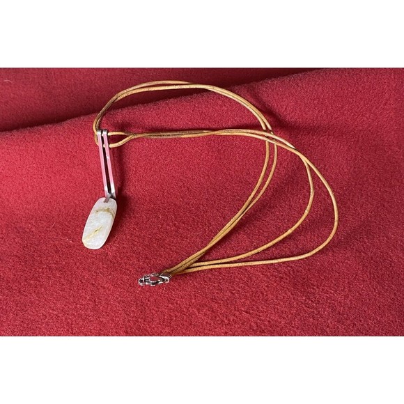 Necklace Emporio Armani Rutilated Quartz With Leather Cord This is an excellent gender neutral necklace made of faceted, golden colored, rutilated quartz. The metal on the pendant appears to be stainless steel.
