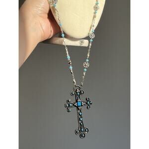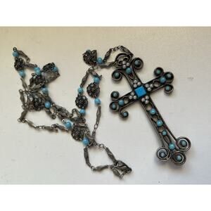 Necklace Filagree Roman Cross with Blue Acrylic Stones Silver Tone Long 32”