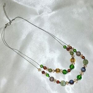 Necklace Green Amber Purple Art Glass Beads 2 Gold chains layered 18" Classic