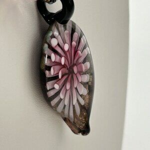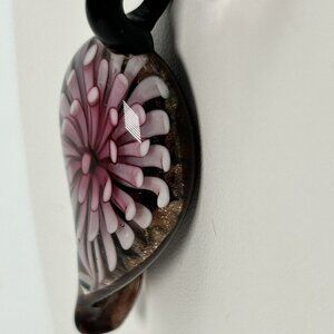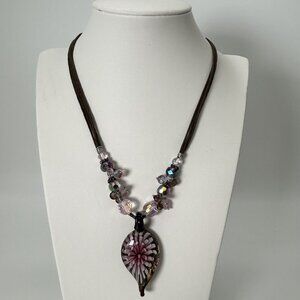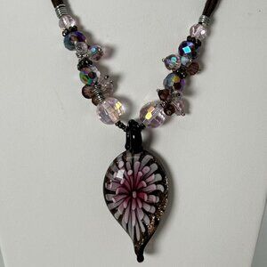 Excellent Condition. Brown cord chain, lobster clasp, measures approx. 18" long. Pink faceted plastic spacers. Pendant is handblown with a purple/pink 3D flower and shimmer background.