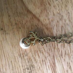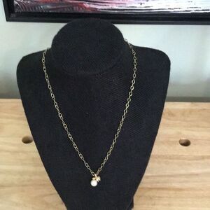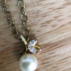 Necklace, Pearl and Rhinestone Pendant, Brass, Gold Color, 18"