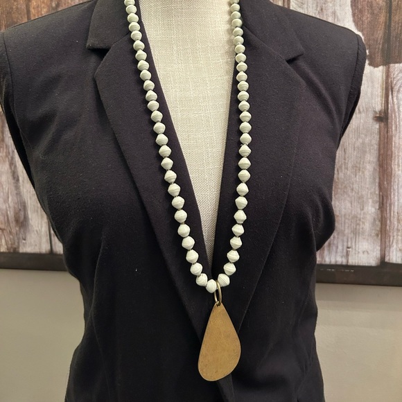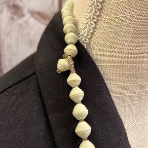 Light aqua paper beaded necklace with closure bead including hammered pendant. Metal has some patina.