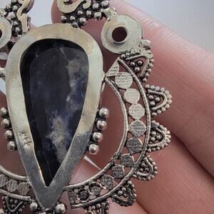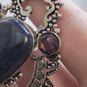 Rich in regal tones and artisan craftsmanship, this statement pendant centers on a faceted teardrop-shaped iolite gemstone known for its deep violet-blue hues and subtle inner glow. Surrounding the centerpiece are three faceted round and pear-shaped amethyst stones, each showcasing a rich plum tone that enhances the pendant’s dramatic elegance. Handcrafted in 925 stamped sterling silver, the intricate design work features granulated accents and ornate detailing, offering an antique-inspired look with contemporary luxury. Measuring approximately 3 inches long, this one-of-a-kind pendant makes a bold, unforgettable accessory. A complimentary 20-inch sterling silver snake chain is included, making it ready to wear or gift upon arrival.