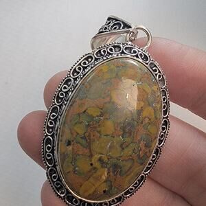 Celebrate nature’s artistry with this one-of-a-kind Rainforest Jasper pendant, handcrafted in ornate 925 sterling silver. The gemstone showcases an organic mosaic of green, yellow, and earthy brown tones with intricate natural veining, reminiscent of a forest floor after rain. Its smooth oval cabochon cut enhances the stone's earthy depth and texture, while the silver frame features intricate scroll and bead detailing for a timeless artisan finish. This pendant is more than jewelry it's wearable art for lovers of nature and craftsmanship. Meticulously made by hand and paired with a complimentary 20-inch sterling silver snake chain, this pendant offers a luxurious and grounding accessory for any collection.