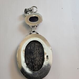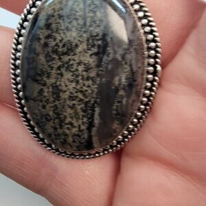 This exquisite handmade pendant showcases a rare pairing of gemstones: a lavender-toned Tiffany stone cabochon set above a large, earthy dendritic jasper or agate centerpiece. The upper Tiffany stone displays a gentle purple hue with opalescent softness, while the larger stone below features tree-like mineral inclusions in a deep, grounding color palette. Each gem is bezel-set in 925 sterling silver, surrounded by intricate granulated silverwork and completed with an ornately patterned bail. Tiffany stone is highly sought for its rarity and spiritual resonance, while dendritic stones are known for their nature-inspired patterns and grounding energy. The pendant is paired with a complimentary 20-inch sterling silver snake chain, making it wearable straight out of the box. A bold, one-of-a-kind piece ideal for collectors, crystal lovers, and admirers of artisan craftsmanship.