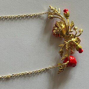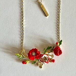 This necklace is crafted from flamboyant poppies and an elegant daisy. The red poppies form the backdrop for this necklace, evoking the warmth of the summer sun. Every detail is captured with precision, allowing the poppies to intertwine harmoniously to create a floral explosion. At the heart of this composition, the daisy adds a note of freshness and innocence. The delicate, pure petals of this flower spread out gracefully, contrasting magnificently with the intensity of the red poppy that surrounds it. Match this necklace with the poppy and golden bead earrings.Length : 40