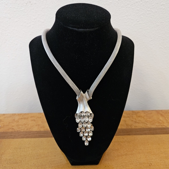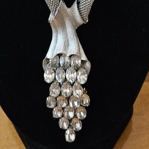 This necklace is so elegant and beautiful to finish off, any outfit at the height of style. Thick 18", silver mesh, spring clasp closure, large oval prong clear set rhinestones, waterfall design. Pendant measures 3"× 1"