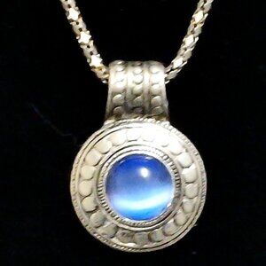 This elegant vintage necklace features a striking blue stone set in a detailed silver pendant. The intricate chain and pendant design exude sophistication and timeless style. The adjustable clasp ensures a comfortable fit for various neck sizes. Ideal for those seeking a unique and classy accessory.