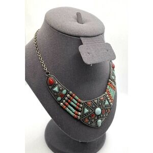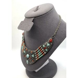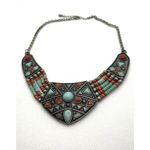 Necklace Southwest Bib Necklace Faux Turquoise Faux Coral Pewter Finish 16”+2”.