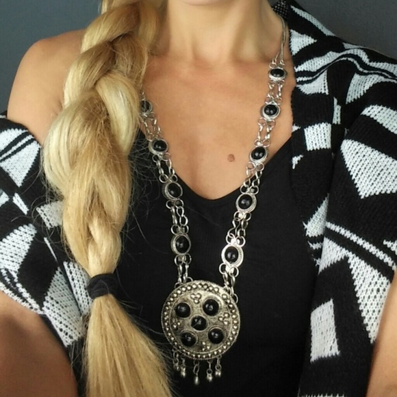 Goregous Boho necklace. Each necklace is unique and hand crafted in India. Black beads on silver toned metal with naturally accuring patina. If you love bohemian vibes this necklace is a most have!