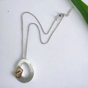 This gold and silver tone necklace is on a classic silver tone snake chain. This necklace has a length of 24", or for a longer look of 26" when using the extender . The vintage large oval pendant is 2 inches in length with a gold square and crystal detail on the side to make a perfect design for everyday or dressy styles.