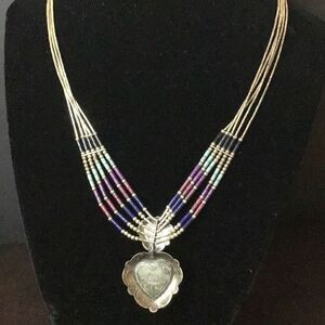 Necklace Vintage multistrand, Multicolor bead and heart sterling silver