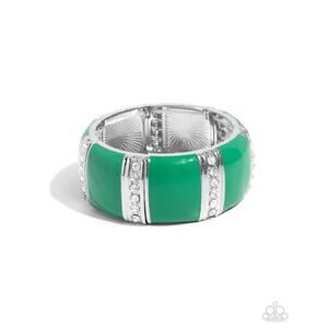 Infused along elastic stretchy bands, Mint-painted square frames alternate with thin silver vertical bars dotted in faceted crystal-like white rhinestones, creating a statement-making pop of color along the wrist.