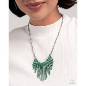 Varying in length, mismatched silver vertical bars alternate with Mint-painted vertical bars that stream from the center of a classic silver chain. Faceted crystal-like white rhinestones dot along the free-falling Mint bars, creating a statement-making fringe below the collar. Features an adjustable clasp closure.