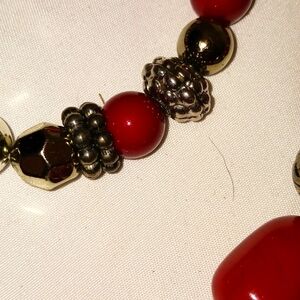 Bracelet also has the same type of metal beads and red beads. It is a stretch bracelet.