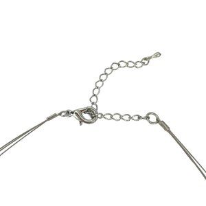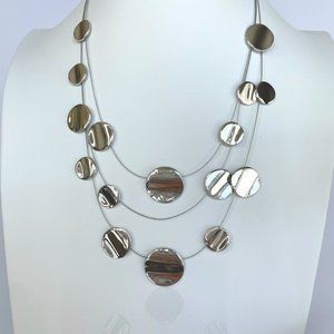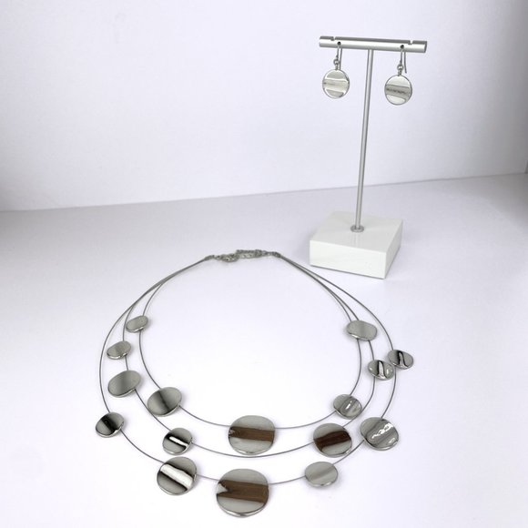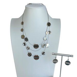 This 3 strand silver tone illusion necklace and earring set is versatile enough to be worn for both formal and casual events, adding a touch of elegance to any outfit. The earrings are a french wire with 14mm flat silver ribbed bead drop. It is the perfect accessory to complement your whole look.