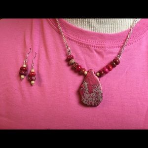 20 1/2 inch pink and tan necklace and earring set on a silver tone chain. Both sides are different, as seen in the pictures. matching earrings are included.