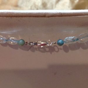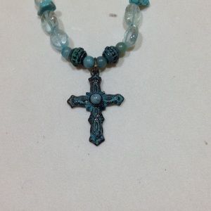 NEW! Aqua glass and turquoise colored stones, contrast with metal patina cross and beads in this 17 inch necklace. 1 inch earrings. Silver toned ear wires and clasp. Never worn. Price firm, no trades.