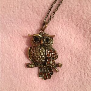 Vintage style bronze tone owl necklace and ring. Ring has a stretchy band. Necklace hangs past cleavage area.