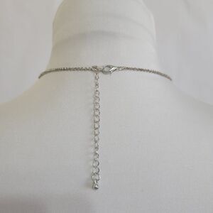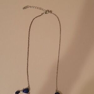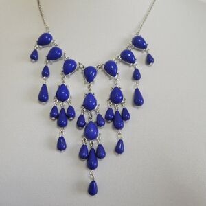 This necklace has a silver toned chain with cobalt blue 'stones'. Unsure of the material but it seems like a plastic or resin material. Adjustable length at back neck. Total length is about 11" from center back to bottom of lowest 'stone'. Chain on right side is slightly discolored. Never worn, no tags.