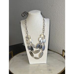 Necklace bib layered oval metal hammered 3 layers silver tone EUC, contemporary