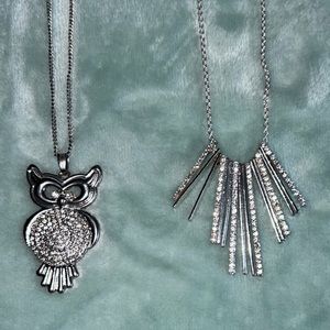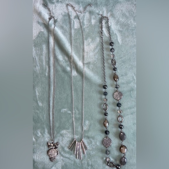 Necklace Bundle of 3 - Owl with Rhinestones - Bedazzled - Beaded & silver accents; taupe, blueish and silver in color